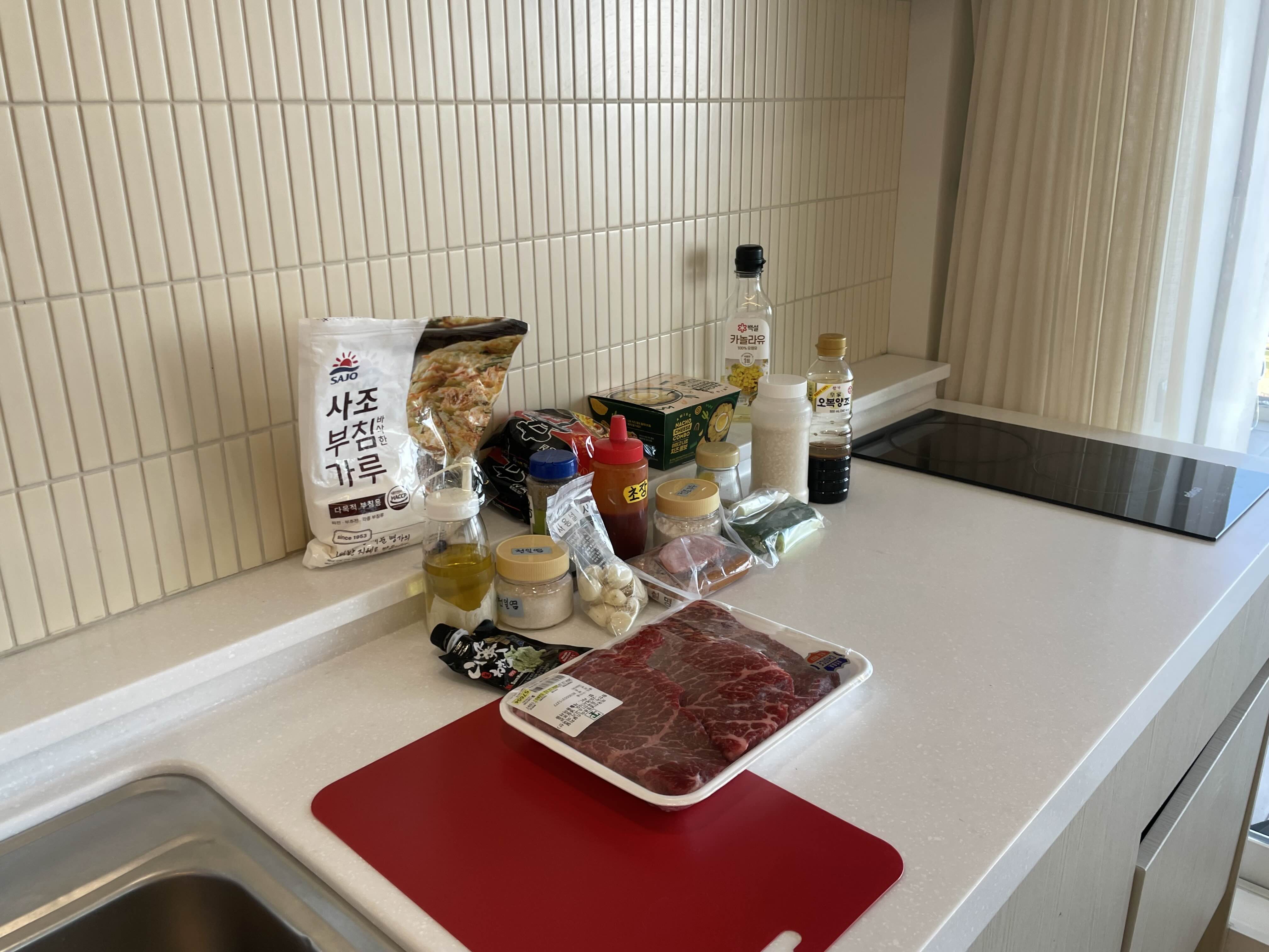 준비해 온 식재료를 부엌에 펼쳐놓고